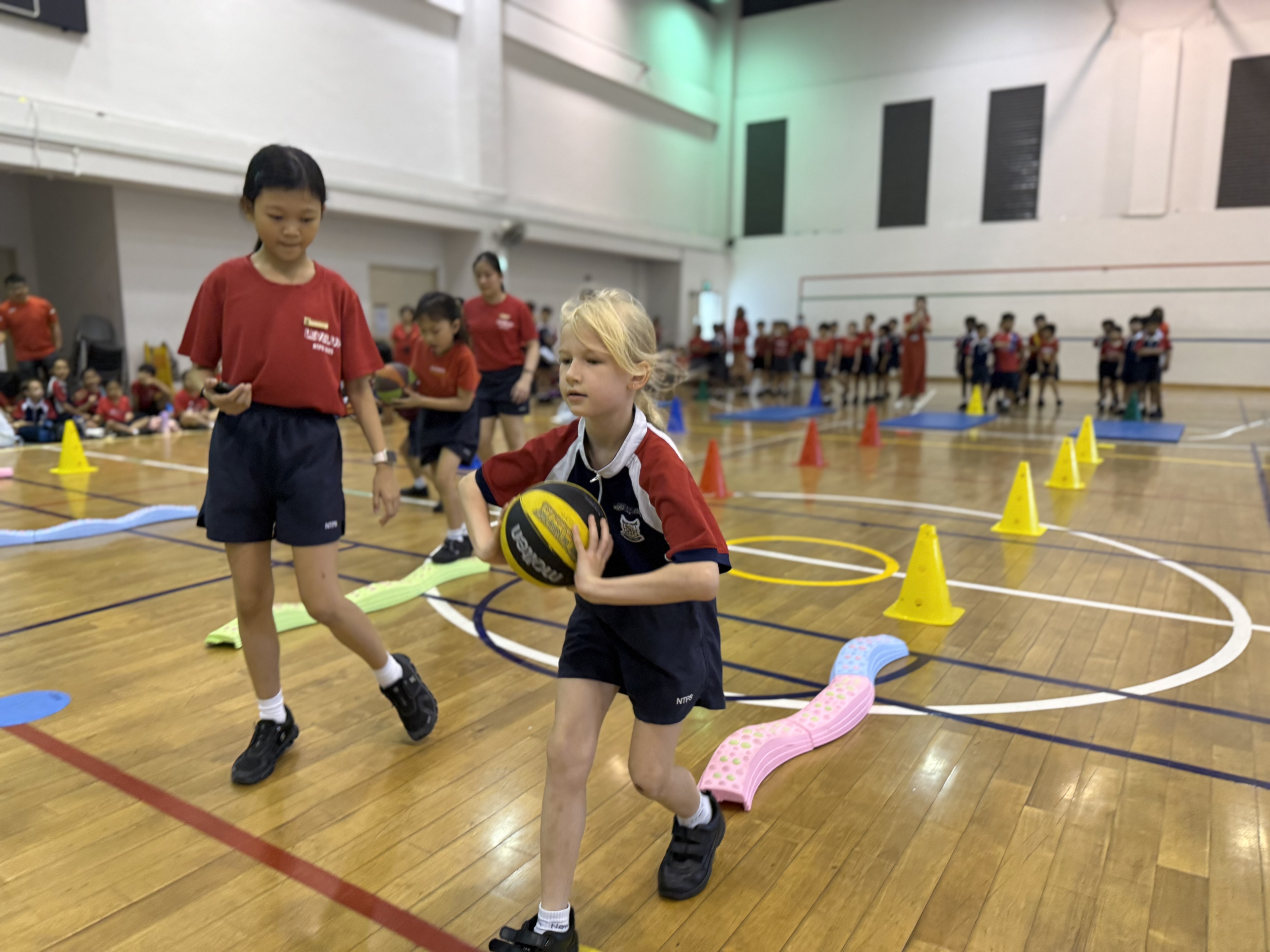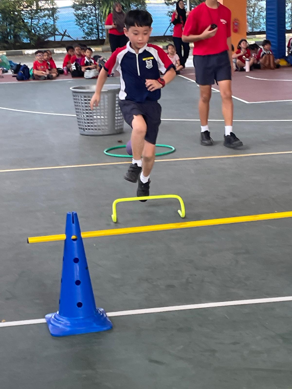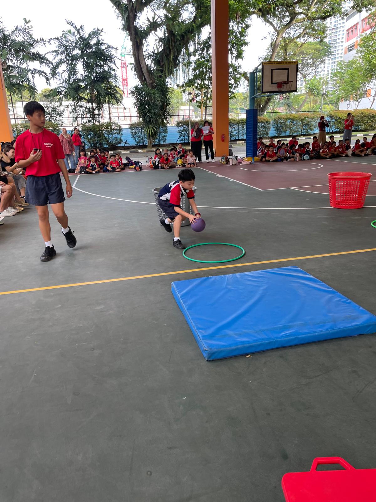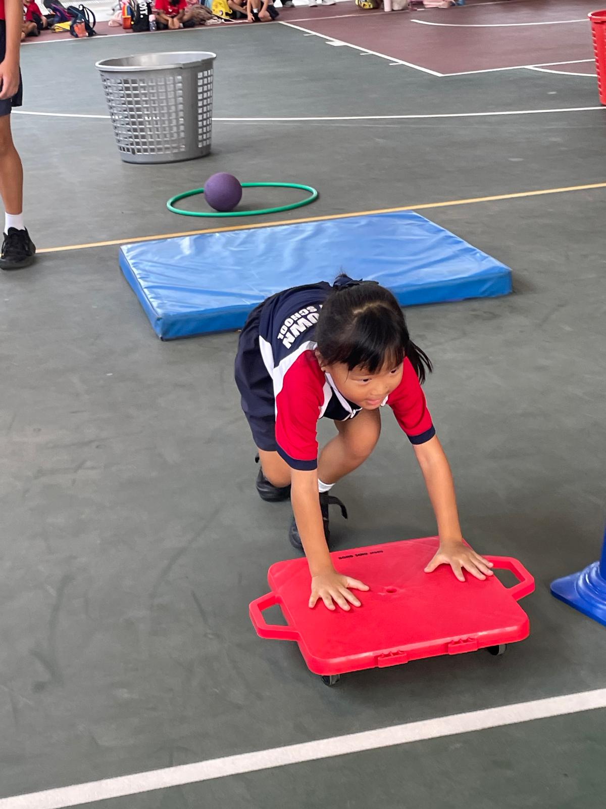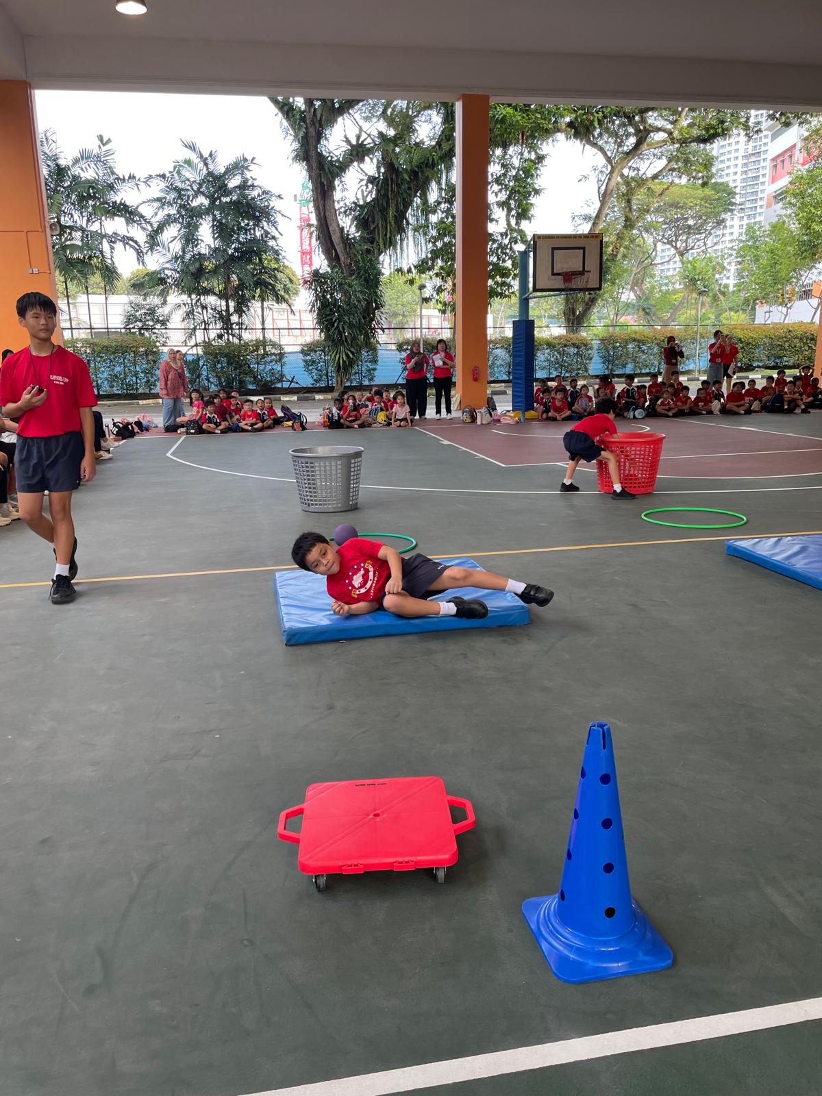 Sports Day is an event for all P1 to P3 students to showcase their learning during PE lessons. Students from the same class have the opportunities to work in a team and challenge their peers from the same level in various physical (locomotion) and gymnastics skills such as running, skipping, throwing, log roll and forward roll.