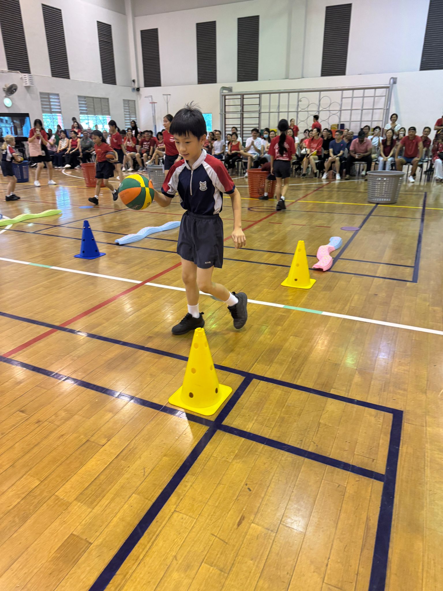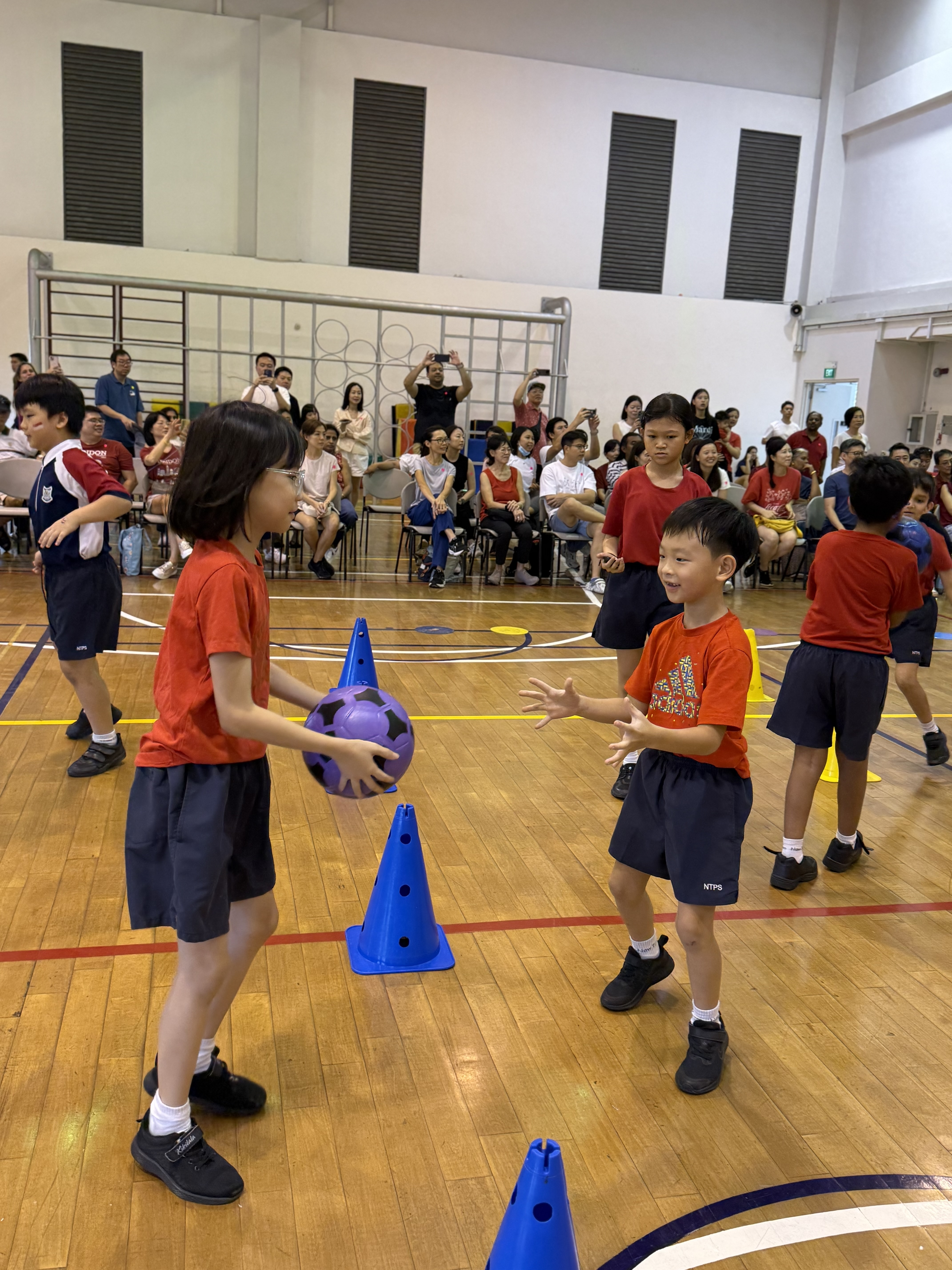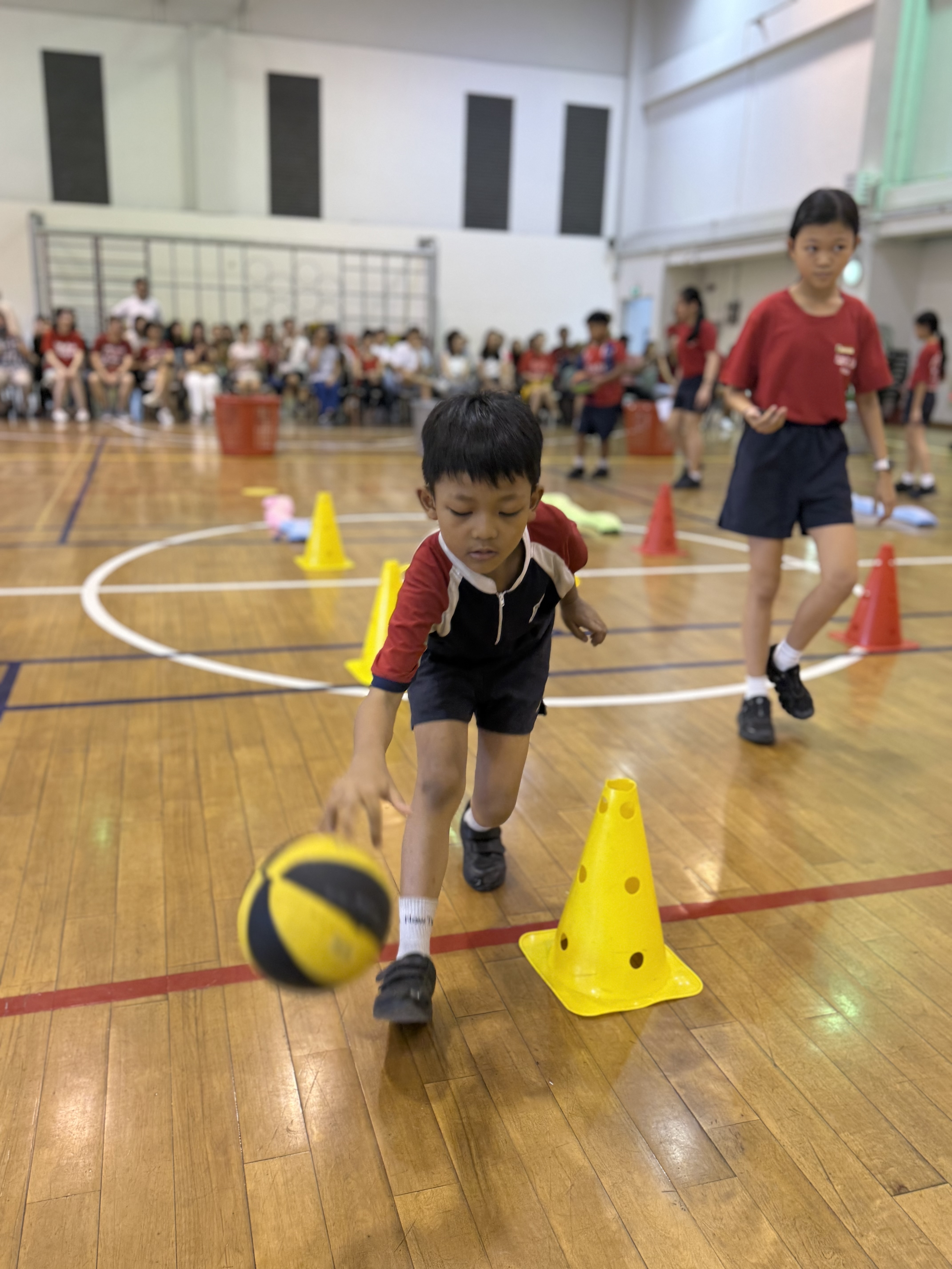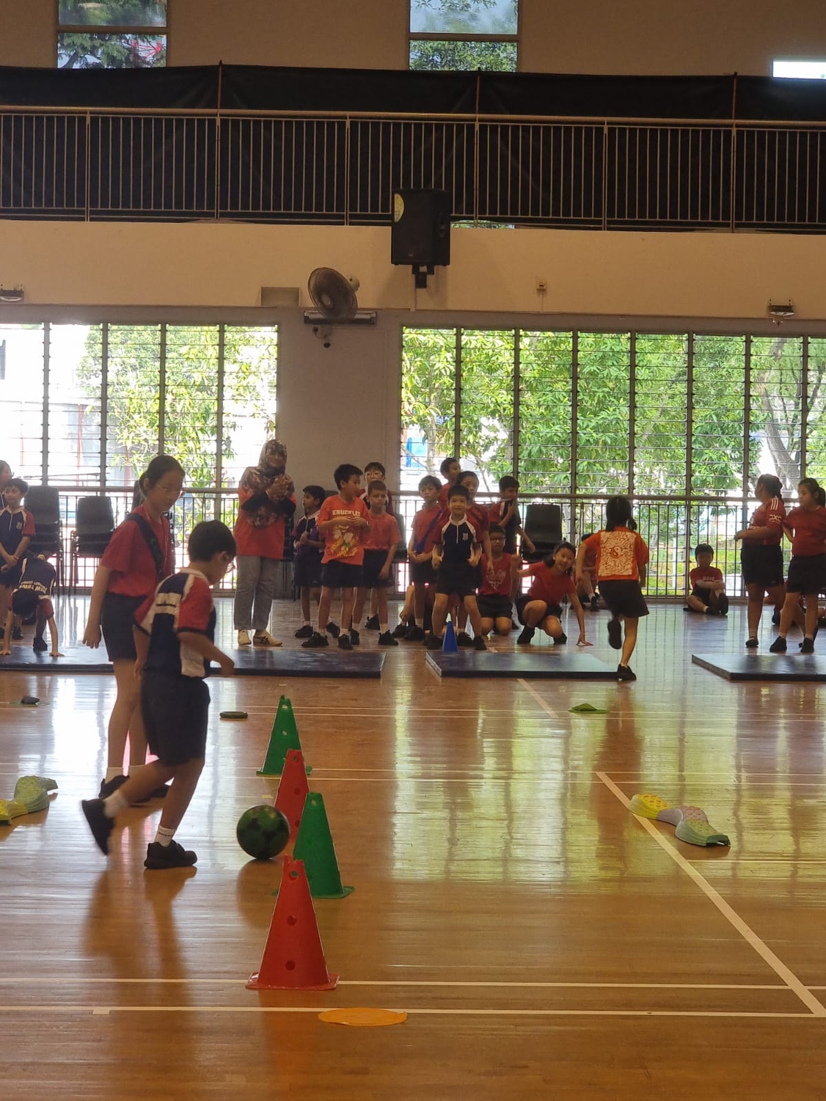 Sports Day is an event for all P1 to P3 students to showcase their learning during PE lessons. Students from the same class have the opportunities to work in a team and challenge their peers from the same level in various physical (locomotion) and gymnastics skills such as running, skipping, throwing, log roll and forward roll.